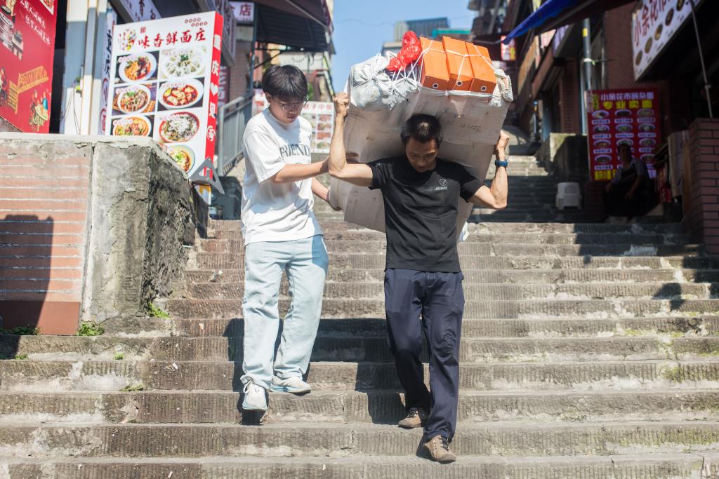 冉光辉(右)在重庆朝天门批发市场搬运货物,冉俊超在一旁小心搀扶(2025年6月14日摄)。冉光辉2007年从老家重庆垫江来到朝天门批发市场做搬运工。十几年间,他每天清晨到市场揽活,步行数万步,扛货、拉货……晚上七八点才能收工回家,经常忙得顾不上吃午饭,一年到头仅春节能休息几天。如今,年近六旬的冉光辉搬重物时需要别人帮忙才能扛上肩膀,但为了儿子冉俊超,他选择咬牙坚持。新华社发(许康平摄)