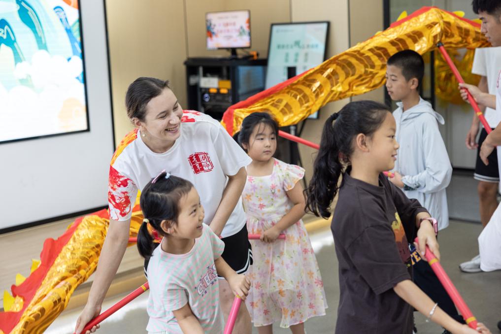 莎河娜斯在浙江省湖州市吴兴区龙泉街道祥和社区教公益暑期班的小朋友舞龙(2024年7月8日摄)。新华社发(伊凡摄)