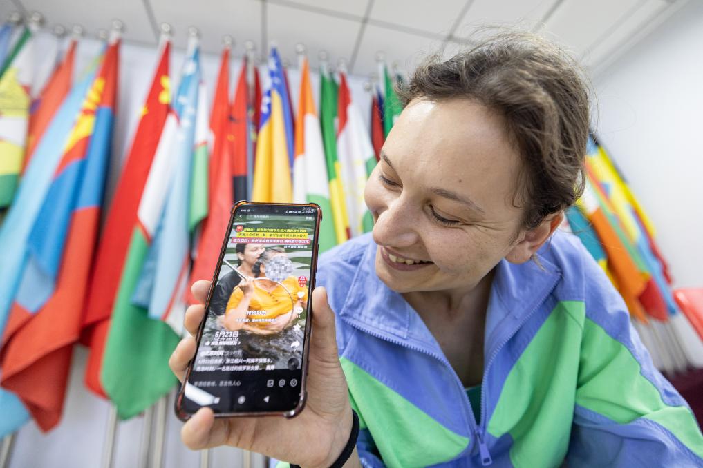 莎河娜斯在浙江湖州师范学院展示社交平台对她救助落水老人的报道(2025年6月23日摄)。新华社发(伊凡摄)