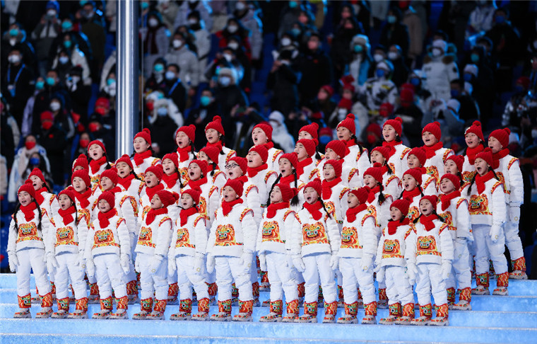 “马兰花儿童合唱团”用希腊语在北京冬奥会开幕式上歌唱。(来源:新华社)
