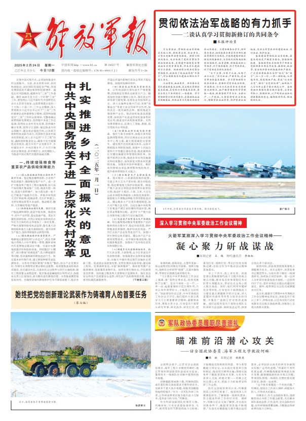 习主席指出,贯彻依法治军战略是系统工程,要统筹全局、突出重点,以重点突破带动整体推进。新修订的共同条令,充分体现了党的军事指导理论创新成果,是构建中国特色军事法治体系的重要成果,涉及军队建设的方方面面。抓好新修订的共同条令贯彻落实,就抓住了依法治军的“牛鼻子”,对全面提高军队建设正规化水平意义重大。