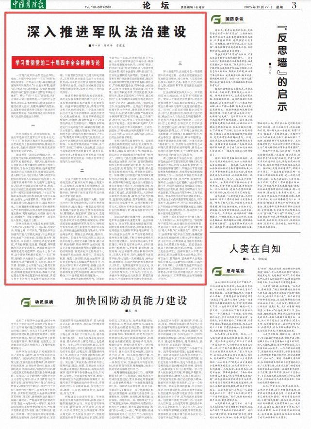 一支现代化军队必然是法治军队。党的二十届四中全会对“十五五”时期“如期实现建军一百年奋斗目标,高质量推进国防和军队现代化”作出重大部署,强调“深入推进军队法治建设,加强法规制度供给和执行监督,完善中国特色军事法治体系”。踏上开启“十五五”新征程,我们必须深入学习贯彻党的二十届四中全会精神,深刻认识和把握深入推进军队法治建设的重大意义、关键举措和实践要求,以高度的使命感和责任感抓好依法治军战略贯彻实施,为高质量推进国防和军队现代化提供坚强法治保障。