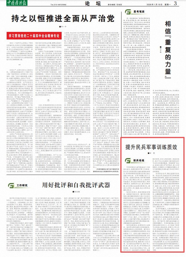 军事训练是生成和提高战斗力的基本途径,是最直接的军事斗争准备。民兵作为我国武装力量的重要组成部分,其军事训练质效直接关系到应战应急能力的生成。必须牢固确立战斗力这个唯一的根本的标准,将军事训练摆在中心位置,聚焦主责主业,以强烈的忧患意识、责任意识和使命意识,革新训练理念、创新组训方法、强化训练保障,切实将练兵备战要求落到实处,锻造召之即来、来之能战、战之必胜的过硬民兵队伍。