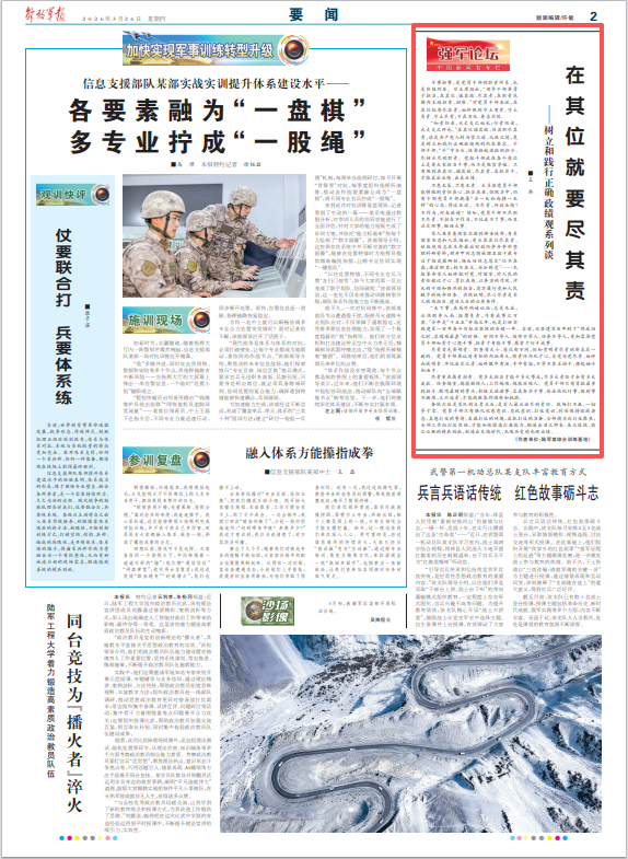 军人肩负着保家卫国的神圣使命,身系国家安危和人民福祉,更应在其位尽其责。林俊德同志在生命最后时刻仍争分夺秒整理科研资料,程开甲同志隐姓埋名数十载专注于核武器研制,杨业功同志笃定“位不在高,廉洁则名;权不在大,为公则灵”……无数革命军人始终把对党、对国家、对人民的责任铭记于心、勇扛在肩,以务实的作风、冲天的干劲和强烈的担当,忠实履行党和人民赋予的使命任务。实践证明,尽心尽责是军人铁肩担当、建功立业的必要条件。