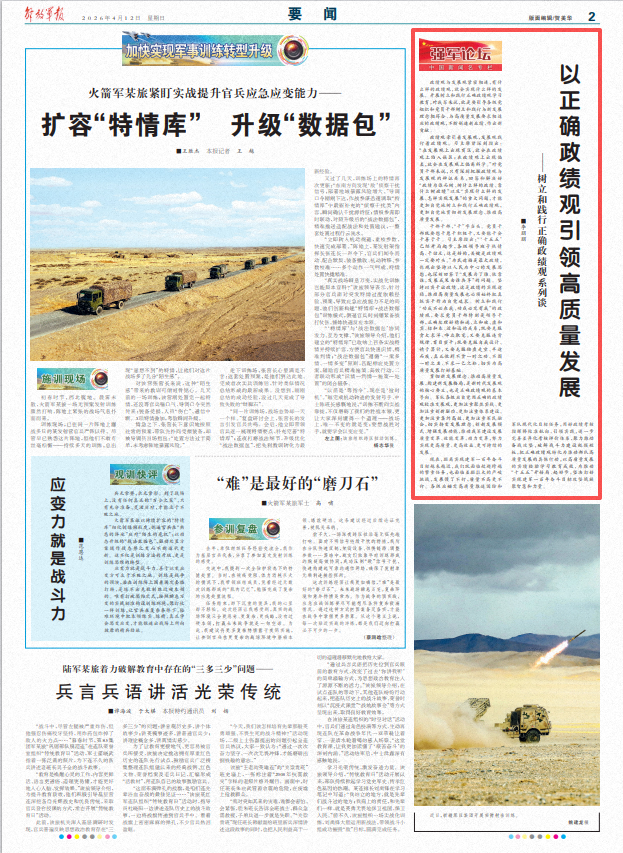 现在,距离实现建军一百年奋斗目标越来越近,我们既面临赶超跨越的繁重任务,也面临差距拉大的严峻挑战,发展慢了不行,质量不高更不行。各级应锚定高质量推进国防和军队现代化目标任务,用好政绩考核指挥棒校准航向、引领实践,进一步完善差异化考核评价体系,聚力推动备战攻坚,破解战斗力建设瓶颈短板,把正确政绩观转化为推动部队高质量发展的具体行动,以高质量发展的实绩检验学习教育成效,为推动“十五五”开好局、起好步,坚决打好实现建军一百年奋斗目标攻坚战凝聚智慧和力量。