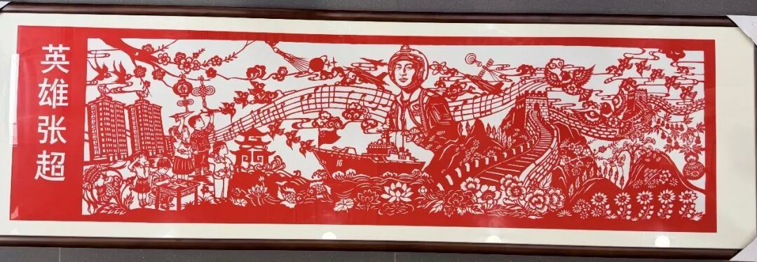 今年清明节期间,岳阳市九中教育集团150余名师生代表用非遗剪纸创作了2米长的《筑梦海天 纪念张超烈士牺牲十周年》,融入29种元素,以此致敬英雄牺牲时年仅29岁的芳华。