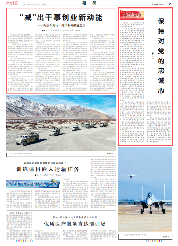 保持对党的忠诚心,还要忠诚党的事业。“加入党,就要为共产主义信仰奋斗到底。作为个人来说,奋斗到底就是奋斗到死。”这是刘志丹同志的入党誓言。他用短暂而辉煌的一生,践行了对党的事业的忠诚。历史告诉我们,以身许党许国,忠诚党的事业,才能把强国强军事业推向前进。新征程上,每名党员干部都应自觉为党分忧、为国尽责、为民奉献,勇于担责担难担苦担险,为打好实现建军一百年奋斗目标攻坚战贡献力量,以实际行动诠释对党的忠诚。