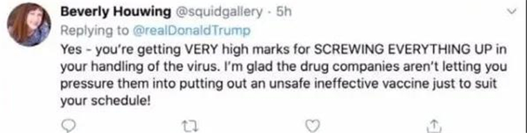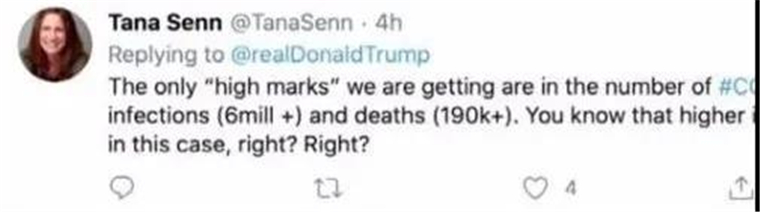 △美国网民:美国政府唯一得到的“高分”就是超过600万新冠肺炎确诊病例和超过19万死亡病例。