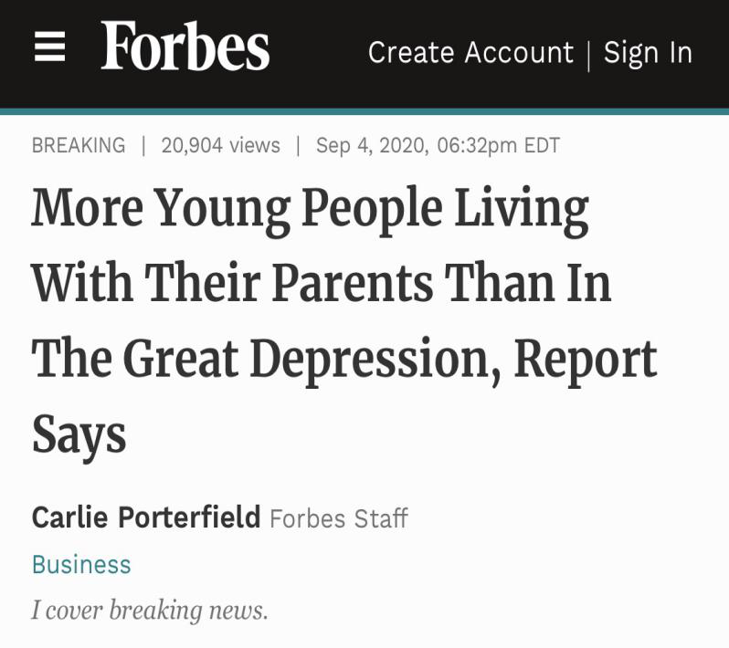 △《福布斯》称,研究发现如今与父母同住的年轻人比大萧条时期还多