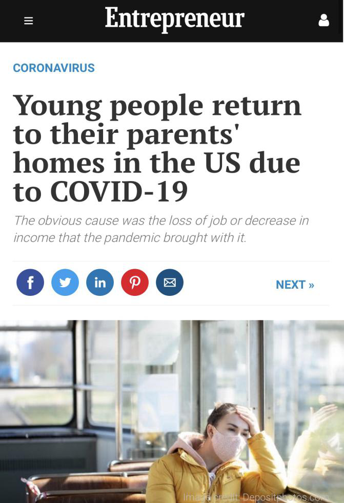 调查显示:“23%的年轻人因为校园关闭而搬家,18%的年轻人则是因为失业或其他经济原因搬家。”调查同时发现,“啃老”的人数在各个种族、性别、居住环境和地理位置的年轻人中都有显著提高。