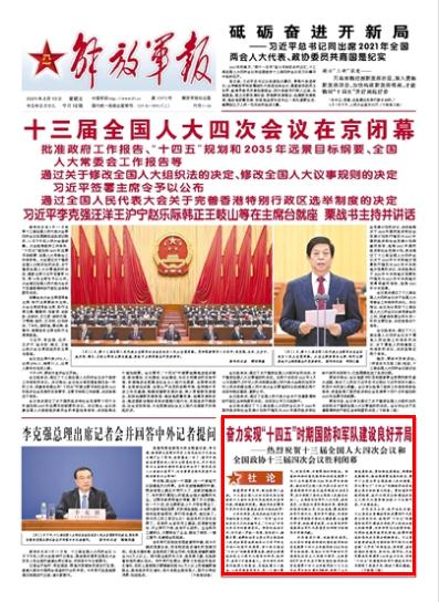 今年的两会,是在庆祝我们党百年华诞的重大时刻、“两个一百年”奋斗目标历史交汇的关键节点、“十四五”开局之年召开的重要会议。两会的成功召开,对于进一步统一思想、坚定信心、凝聚力量,鼓舞和动员全党全军全国各族人民更加紧密地团结在以习近平同志为核心的党中央周围,齐心协力推动“十四五”时期高质量发展,确保全面建设社会主义现代化国家开好局、起好步,具有十分重要意义。会议审议并批准的政府工作报告,总结成绩令人振奋,工作举措务实有力,是一个凝心聚气、攻坚克难、开新图强的好报告。审查和批准的国民经济和社会发展第十四个五年规划和2035年远景目标纲要,通过的《全国人民代表大会关于完善香港特别行政区选举制度的决定》等,充分体现了党的主张和人民意志的统一。出席会议的军队人大代表、政协委员,以强烈的责任感使命感,着眼党和国家战略全局、长远发展,聚焦国防和军队现代化,紧扣军队建设、改革和军事斗争准备方面的大事要事,认真履行职责,积极建言献策,以自身良好形象展现出军队代表委员的好样子和强军兴军新风貌。