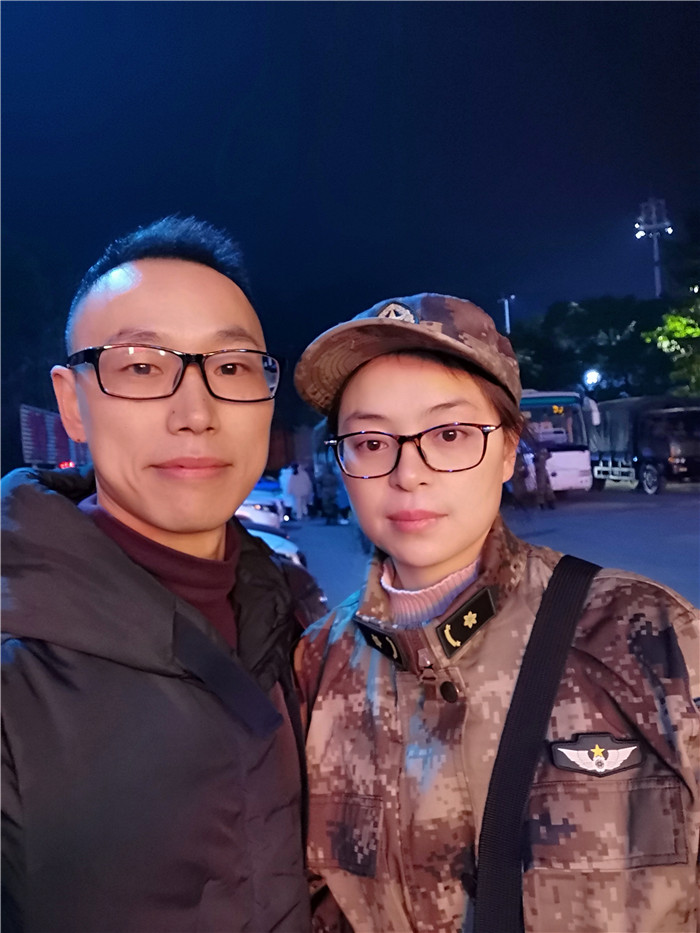 军队支援湖北医疗队队员周培花(右)除夕夜“最美逆行”。这是她的爱人为她壮行。(刘远桥供图)