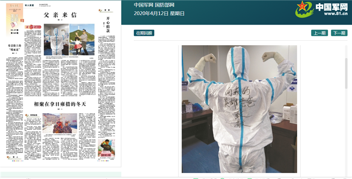 4月12日《解放军报》“军人家庭”版刊发军队支援湖北医疗队队员张睿的文章《父亲来信》,讲述了两代人的战斗故事和精神传承。