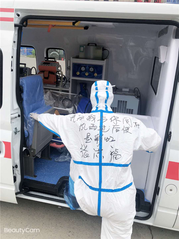 泰康同济新冠肺炎专科医院保障部勤务队士官张洪福在武汉抗疫一线连续战斗了55天,开车跑了13517公里,日均行程超过245公里!定点接送医护人员和工作人员,他当仁不让、准点准时;运送核酸检测标本和血样,他主动请缨、不惧危险,成为医院为数不多进入“红区”、近距离接触病患的保障人员。“只有进行了激情奋斗的青春,只有进行了顽强拼搏的青春,只有为人民作出了奉献的青春,才会留下充实、温暖、持久、无悔的青春回忆。”每当想到自己为武汉人民作出了奉献,张洪福就为自己很拼的武汉战疫而自豪,“‘老腰’再疼都能咬牙挺过去”。告别多雨的武汉,他晒了一张在疫线战斗的照片,护服上写着自己的心声:“武汉,我与你同在,风雨过后便是彩虹。”