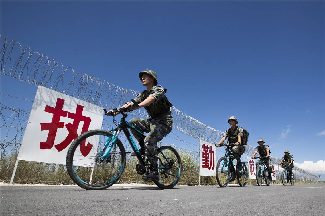 新疆军区霍尔果斯边防连官兵骑自行车在边境线上巡逻。新华社记者琚振华 摄