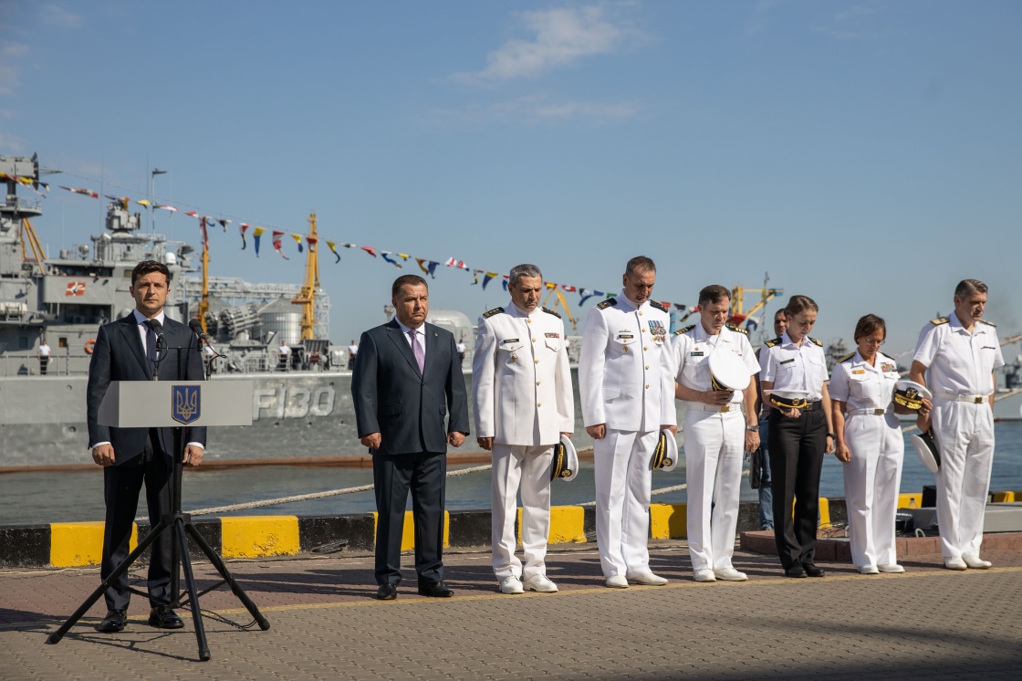7月7日,乌克兰总统泽连斯基(左一)在乌南部敖德萨港视察“海上微风-2019”联合军演时为死难军人默哀。新华社发(乌克兰总统办公厅提供)