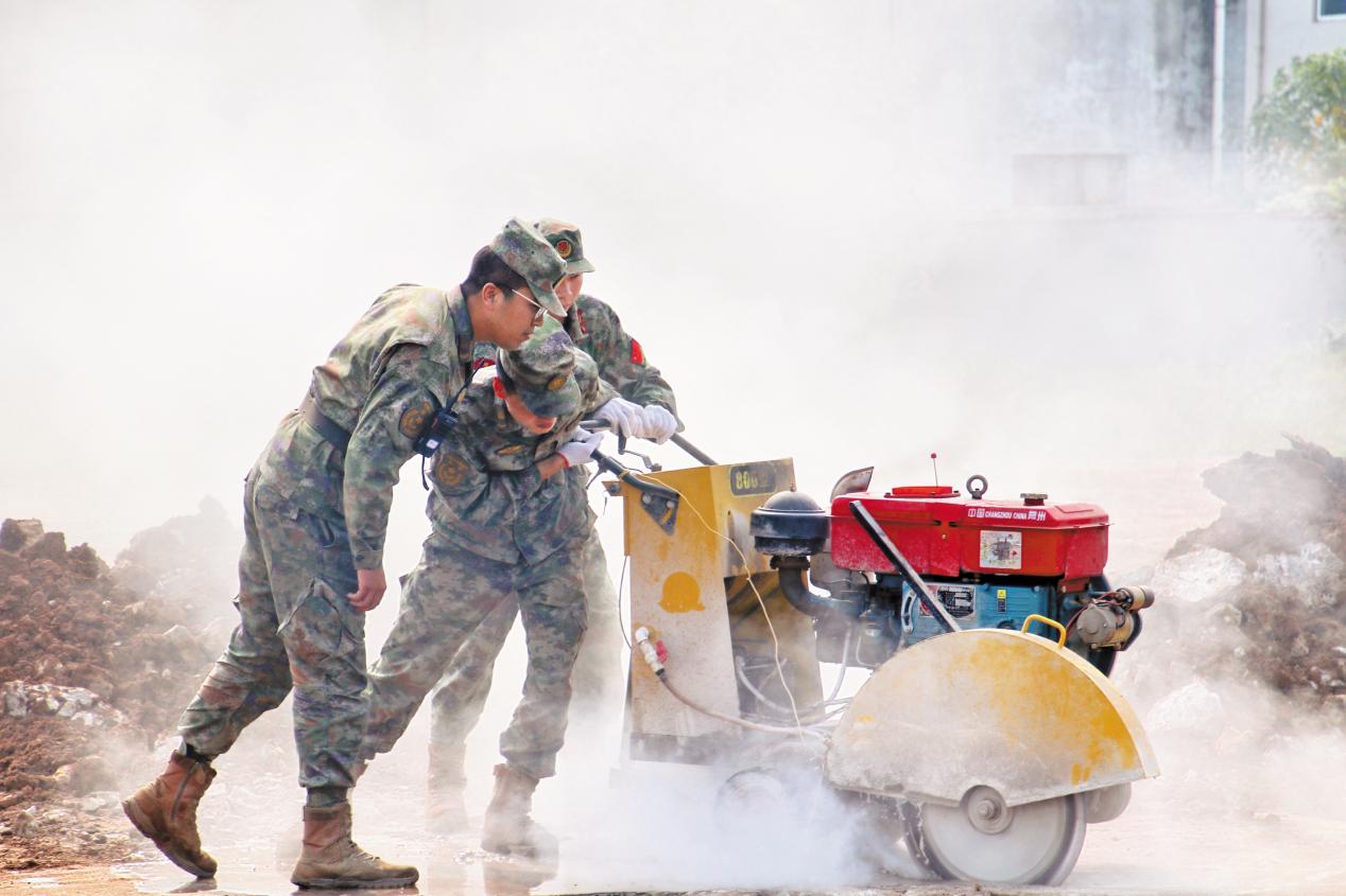 正定县人武部组织民兵专业分队与空军某场站官兵进行道路抢修抢建联演联训。(摄影/王双豹)