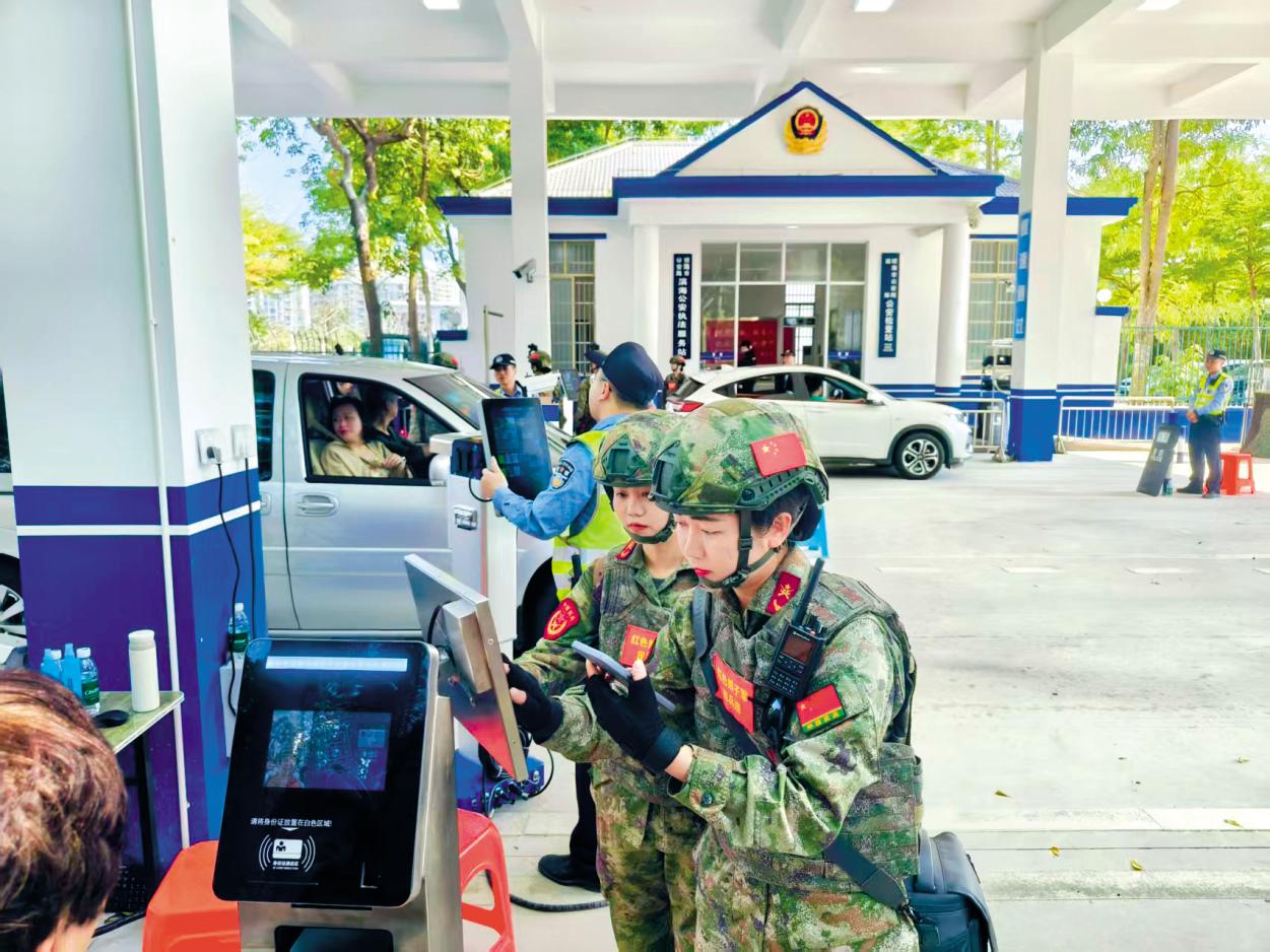 红色娘子军民兵连女民兵在博鳌亚洲论坛2025年年会举行期间对过往车辆进行安检。