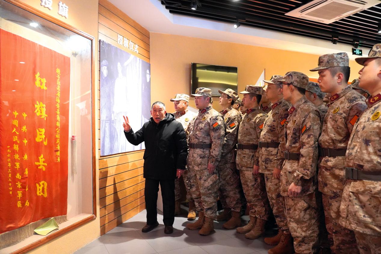 海安市人武部邀请老民兵为新入队民兵讲述角斜“红旗民兵团”的发展历程。
