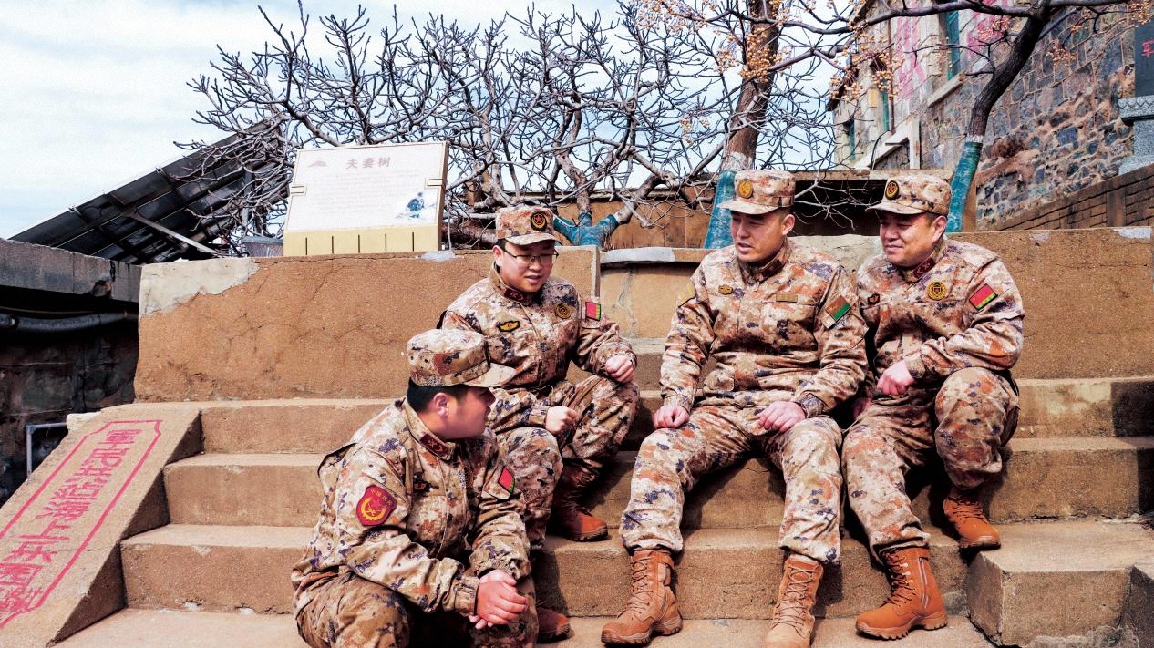 陈志显(右二)在茶余饭后与哨所民兵“唠家常”。(摄影/徐云邦)