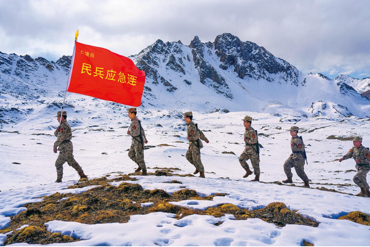 巴塘县人武部组织民兵应急连民兵徒步踏雪巡逻。(摄影/陈建伟)