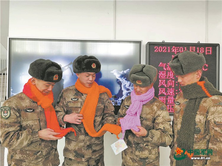 在官兵的注视下,指导员李建阳迫不及待地打开包裹,发现里面是款式不同、颜色各异的40多条围巾。仔细端详,围巾上的针脚细密却不规则,不难看出:这些围巾都是手工编织的。
