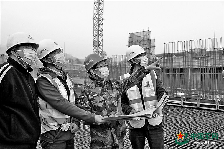 上图:11月上旬,军委后勤保障部工程质量监督中心高级工程师乃国云(右二)在一线检查施工项目。王柔枝摄
