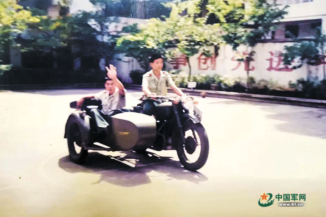 杨勇(右一)服役时进行摩托车驾驶训练。