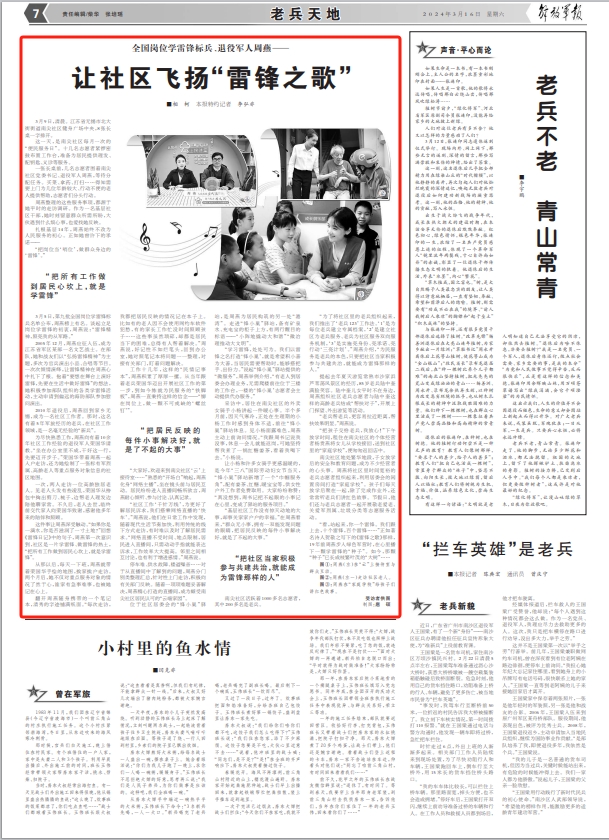“为了将社区里的老兵组织起来,我们推出了‘老兵123’工作法。‘1’是为每位老兵建立专属档案,‘2’是建立社区为老兵服务、老兵为社区服务双向服务机制,‘3’是实施亮身份、亮承诺、亮行动‘三亮计划’。”周燕介绍,“为民服务是老兵的本色,只要把社区当家积极参与共建共治,就能成为雷锋那样的人。”