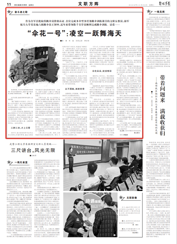 “成功了!”在一片掌声中,王智坤成为全军首批取得跳伞员资格认证的两名文职女教员之一。随后,她又一鼓作气相继完成翼型伞和大飞机空降跳伞训练课目,率先晋升为六级跳伞员,被官兵亲切地称为“伞花一号”。