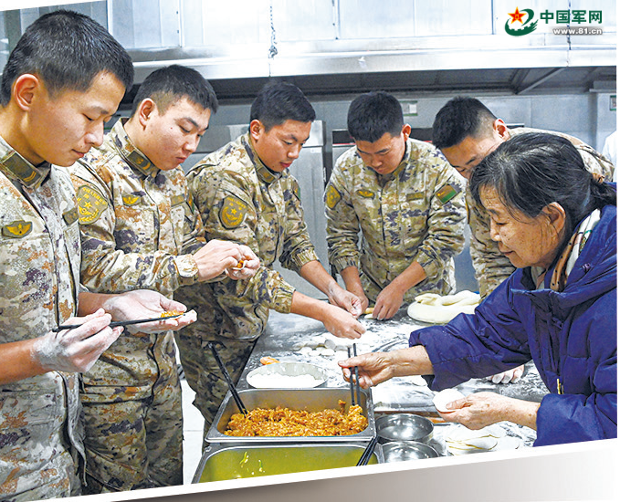 张喜芹在连队食堂与官兵一起包饺子。
