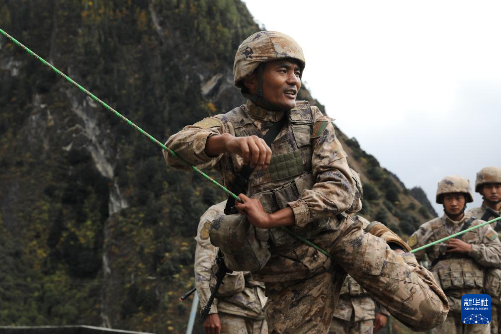 2025年11月1日,西藏军区某团一级上士次罗布给战友示范战术动作。新华社发(于达 摄)