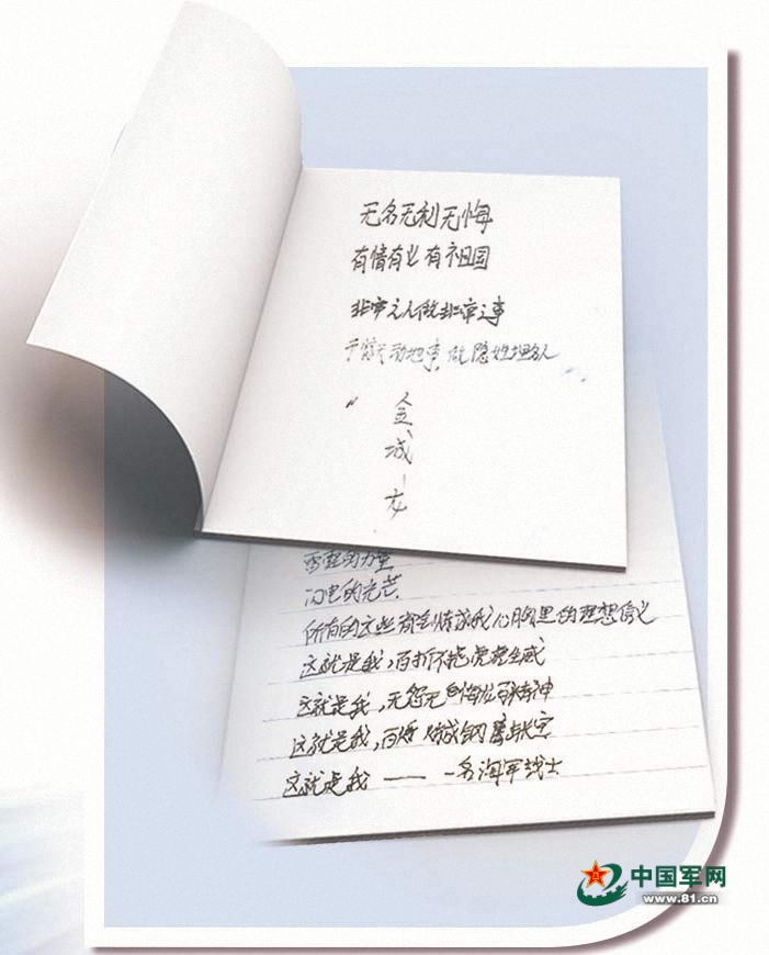 他曾摘抄过一首长诗,结尾几句这样写道:“这就是我,百折不挠虎虎生威/这就是我,无怨无悔龙马精神/这就是我,百炼成钢鹰击长空/这就是我——一名海军战士。”