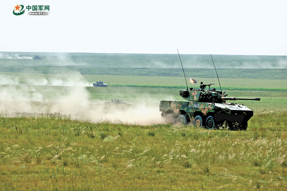 第80集团军某旅组织合成营展开进攻战斗演练。图为装甲战车分队正以战斗队形向“敌”发起冲击。 解放军报特约通讯员 仲崇岭 摄