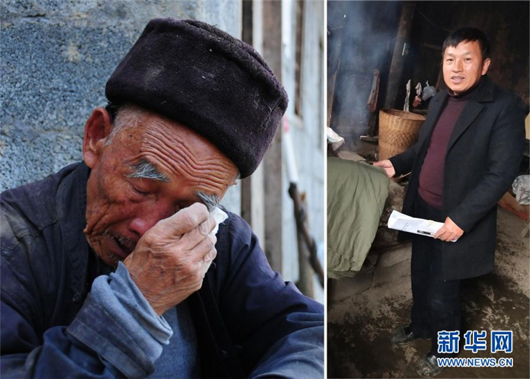 拼版照片:左图为2019年10月1日,贵州省铜仁市沿河土家族自治县中寨镇大坪村村民张信龙谈起文伟红时伤心落泪(新华社记者胡星摄);右图为2018年12月27日,文伟红在沿河土家族自治县中寨镇大坪村村民家中走访。新华社发