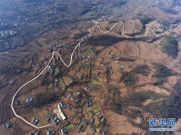这是四川省凉山彝族自治州美姑县九口乡四峨吉村约6公里的道路硬化项目(2017年2月12日摄,无人机照片)。2015年8月,蒋富安由凉山州审计局派到美姑县九口乡四峨吉村任驻村第一书记,2016年8月22日因劳累猝死,年仅26岁。新华社记者 刘坤 摄