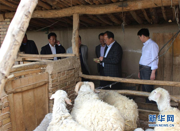 柴生芳(右二)在甘肃省临洮县八里铺镇检查畜牧养殖合作社发展情况(资料照片)。新华社发