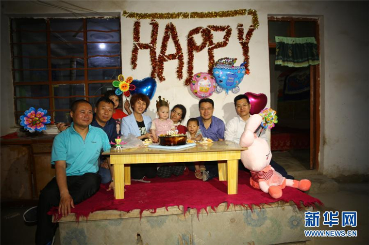 席世明(左二)和其他援疆干部一同给维吾尔族小姑娘“小石榴”过生日(资料照片)。新华社发