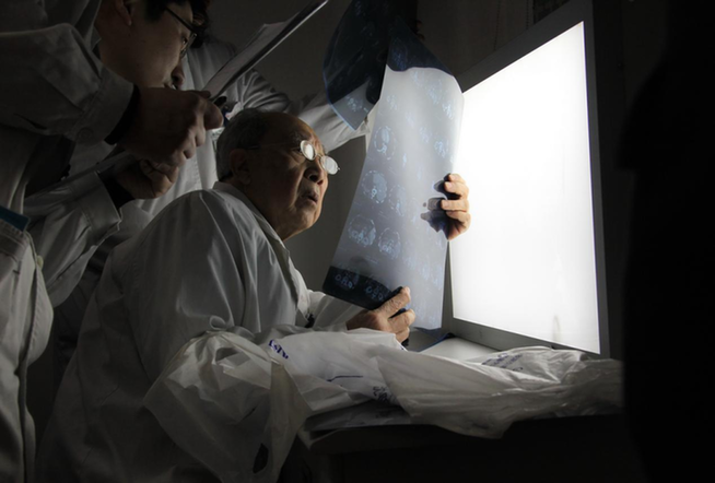 ↑吴孟超带着学生仔细诊断患者病情,确定手术方案。王建民 摄