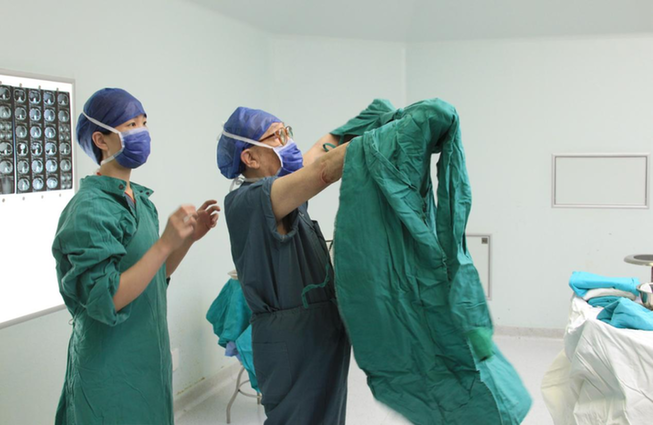 ↑换上手术服,准备进入手术室,主刀第一台手术。王建民 摄