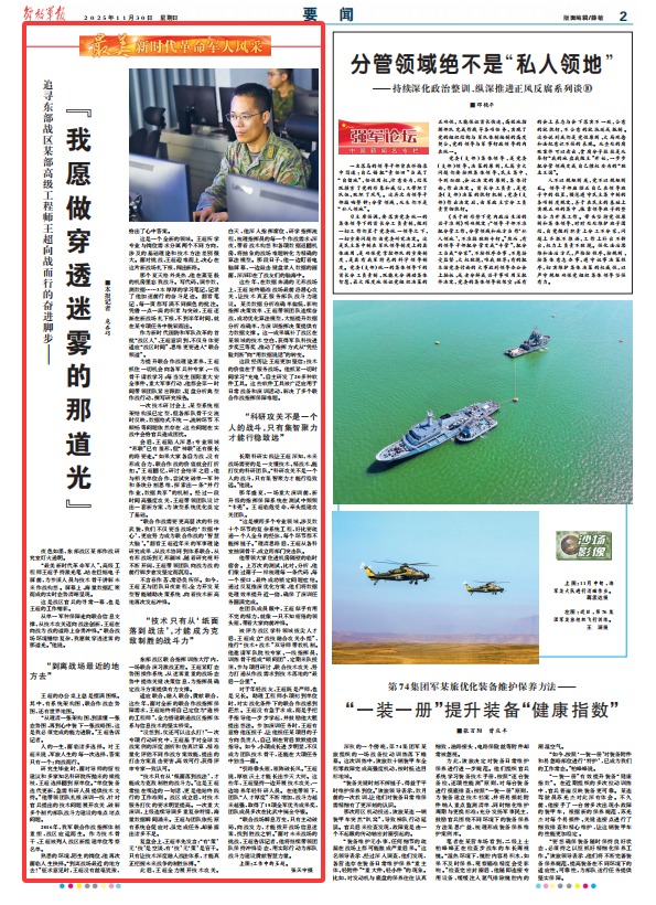 “联合作战需要更高层次的科技武装,我们不仅要当战场的‘数据中心’,更应努力成为联合作战的‘智慧大脑’。”翻看王超近年来的军事理论研究成果,从战术协同到体系联合,从有形战场到无形疆域,随着研究视野不断开阔,王超带领团队向战为战的前行脚步愈发坚定而沉稳。