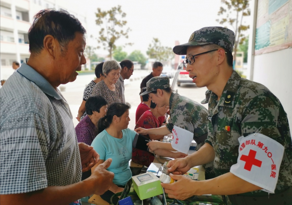 联勤保障部队第901医院药剂科药师王伟迪(右一)在安徽省安庆市望江县江调圩为抗洪一线官兵巡诊(7月17日摄)。新华社发(郝东红 摄)