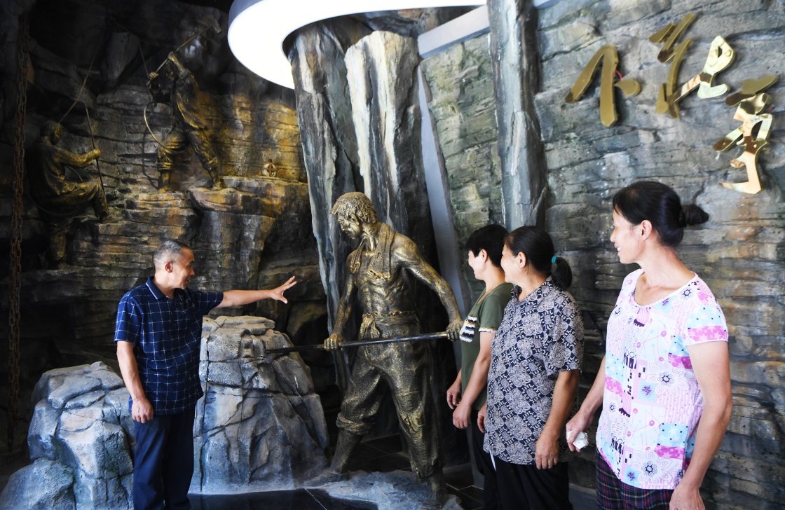 毛相林(左一)在下庄精神陈列馆内讲述当年修路的故事(2020年7月3日摄)。新华社记者 王全超 摄