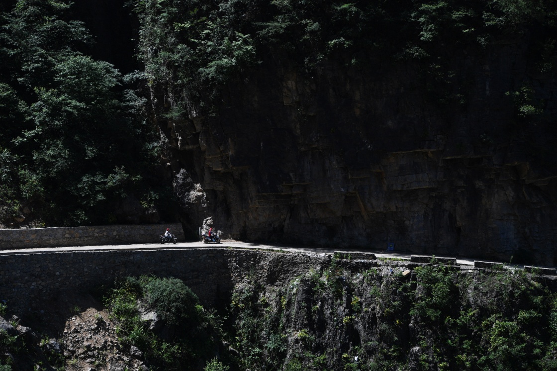 两名下庄村村民骑着摩托车行驶在下庄村通往外界的公路上(2017年6月7日摄)。新华社记者 王全超 摄