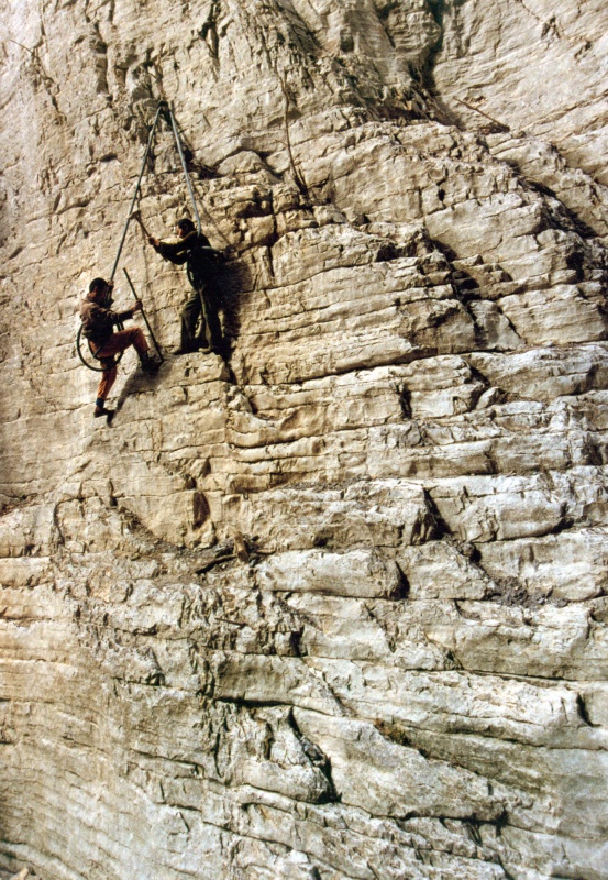 修路远比想象的难。四周陡峭岩壁,很难找到落脚之地,胆子大的腰系长绳站在箩筐里,吊在几百米高的悬崖边钻炮眼,先炸出一小块立足之地,再用锄头、钢钎和大锤,一块一块把石头凿下来。