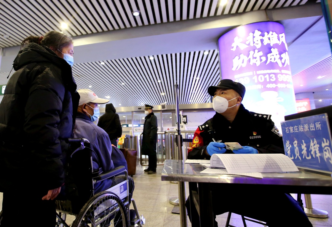 1月18日,石家庄站派出所民警在石家庄火车站内登记旅客信息。新华社发