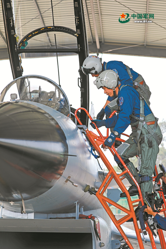 王建东(前)与搭档黄宏亮登上战机。