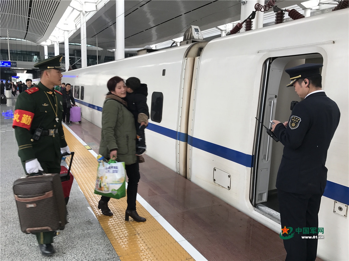 2月1日,春运开始的第一天,担负厦门火车站执勤任务的武警厦门支队官兵帮助带小孩的旅客拿行李。