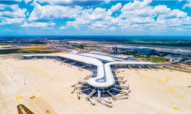 海口美兰国际机场二期扩建项目是海南自贸港建设的重大标志性工程。图为2020年7月6日,海口美兰国际机场二期扩建项目T2航站楼以及综合交通工程等主体工程完工。人民图片 石中华/摄