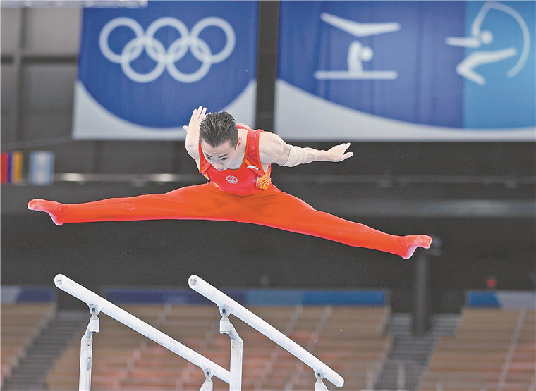 8月3日,在东京奥运会体操项目男子双杠决赛中,中国选手邹敬园夺得冠军。图为邹敬园在比赛中。新华社发
